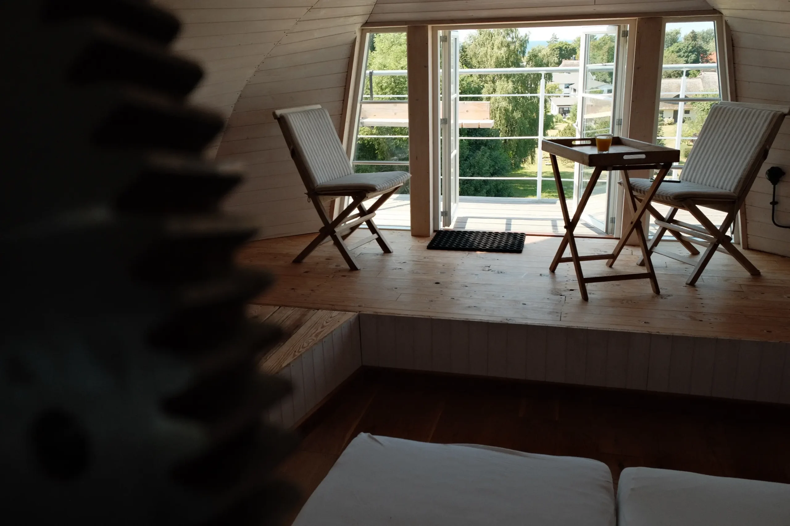 - Zusätzliches Schlafpodest im Dachgeschoss mit einem Futon (160 × 200 cm) als extra Schlafgelegenheit